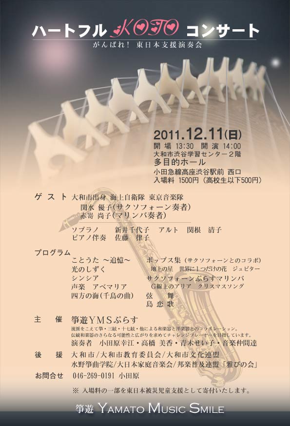 大和市福田2021−2(小田急高座渋谷駅前西口) 日時 :2011年12月11日(日) 開演 :14時00分 主催 :箏遊 YMSぷらす 後援 :大和市 /大和市教育委員会 /大和市文化連盟 水野箏曲学院 /大日本家庭音楽会/ 邦楽普及連盟 「雅びの会」 |